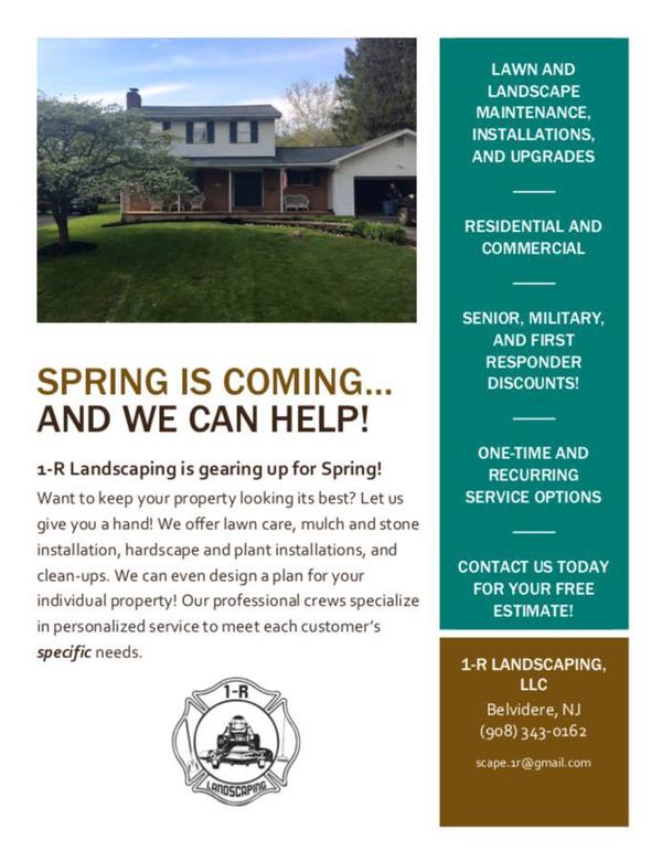 1-R Landscaping is a local landscape company in the Belvidere, New Jersey area. We focus on landscape maintenance and installations. Light design services are available, but we will gladly work with any design provided to provide our customers with the look they want for their property. Since outside your home is not a single-season area, we strive to provide services year round for our clients. From mowing, to clean-ups, to snow plowing, and everything in between: we will do everything we can to keep your property looking its best. We are committed to customer service, supporting our community, and delivering a quality product on every job. Call today for your free lawn care, snow removal, or landscape estimate!
