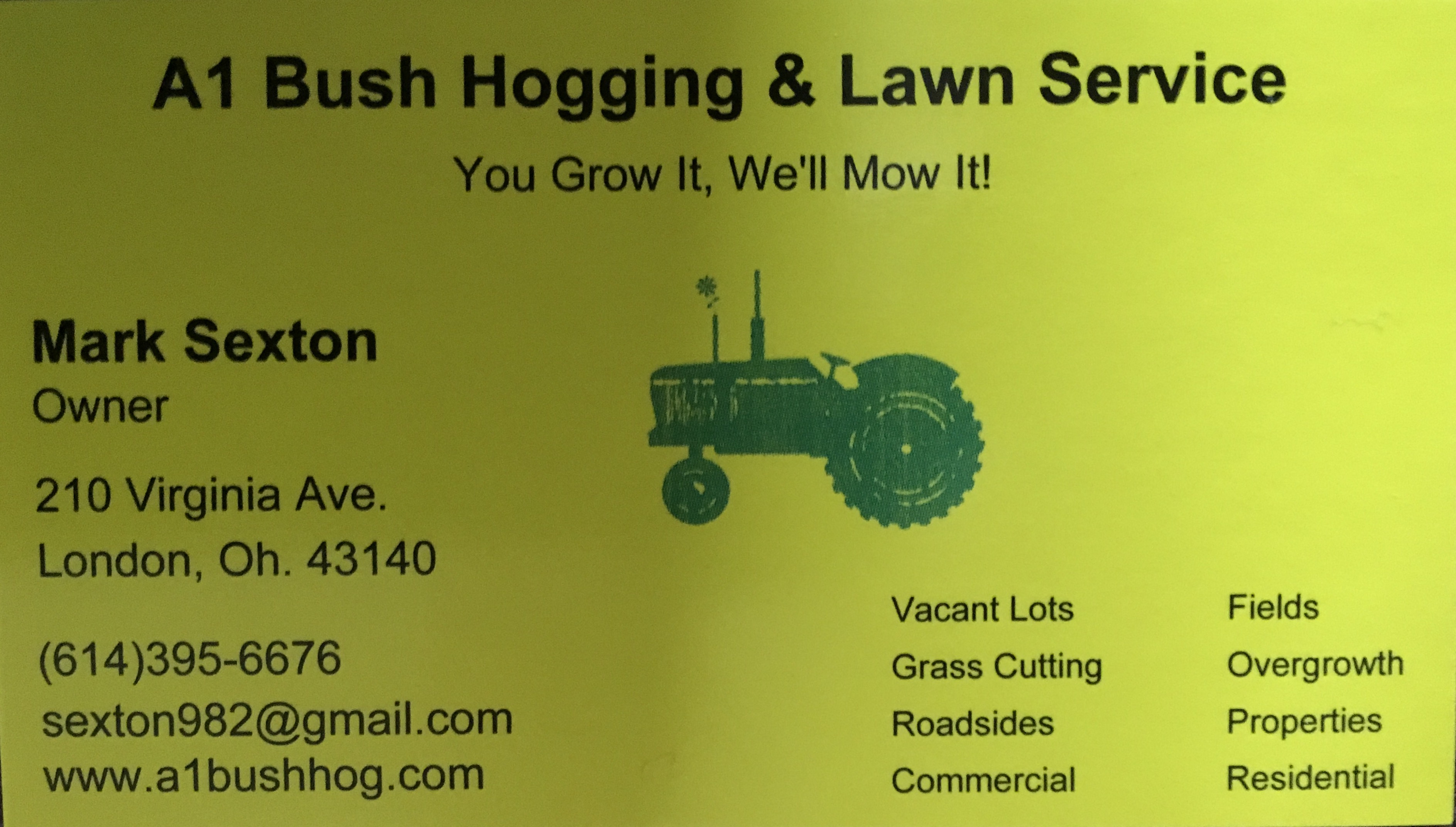 - The experienced and professionals at A1 Bush Hogging & Lawn Service. The size and scope of your project doesn't matter. You will still get outstanding service no matter what. I take on both residential and commercial projects. I will take care of all of your bush hog mowing needs for a reasonable rates. I am available every day, ready to serve you. So if you need a mowing specialist choosing me would be a great option.