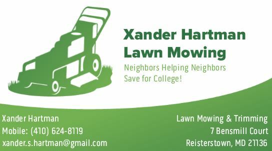 Welcome to Xander's Lawn Service at Stonemill in Reisterstown! Xander mows, trims, edges, and blows townhouse lawns. $15.00 mid units, $20.00 end units, $25 end units with grades. Call now!